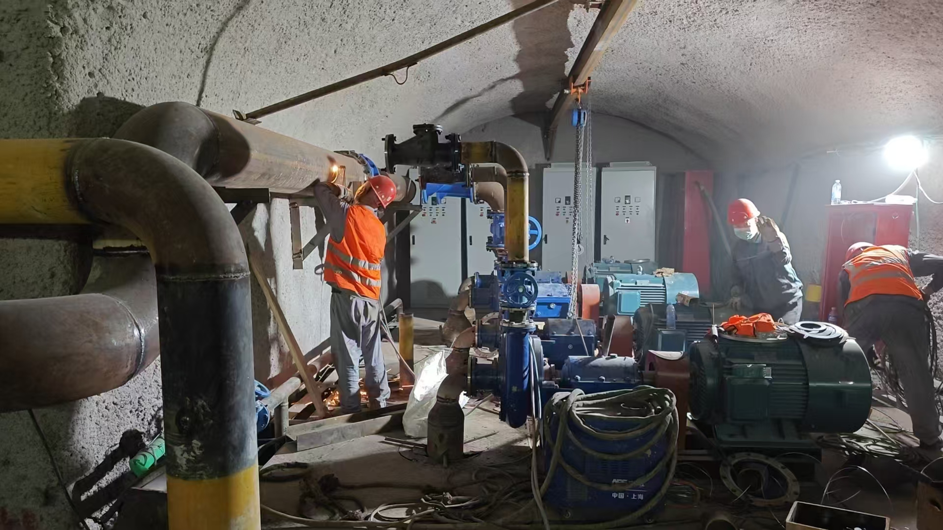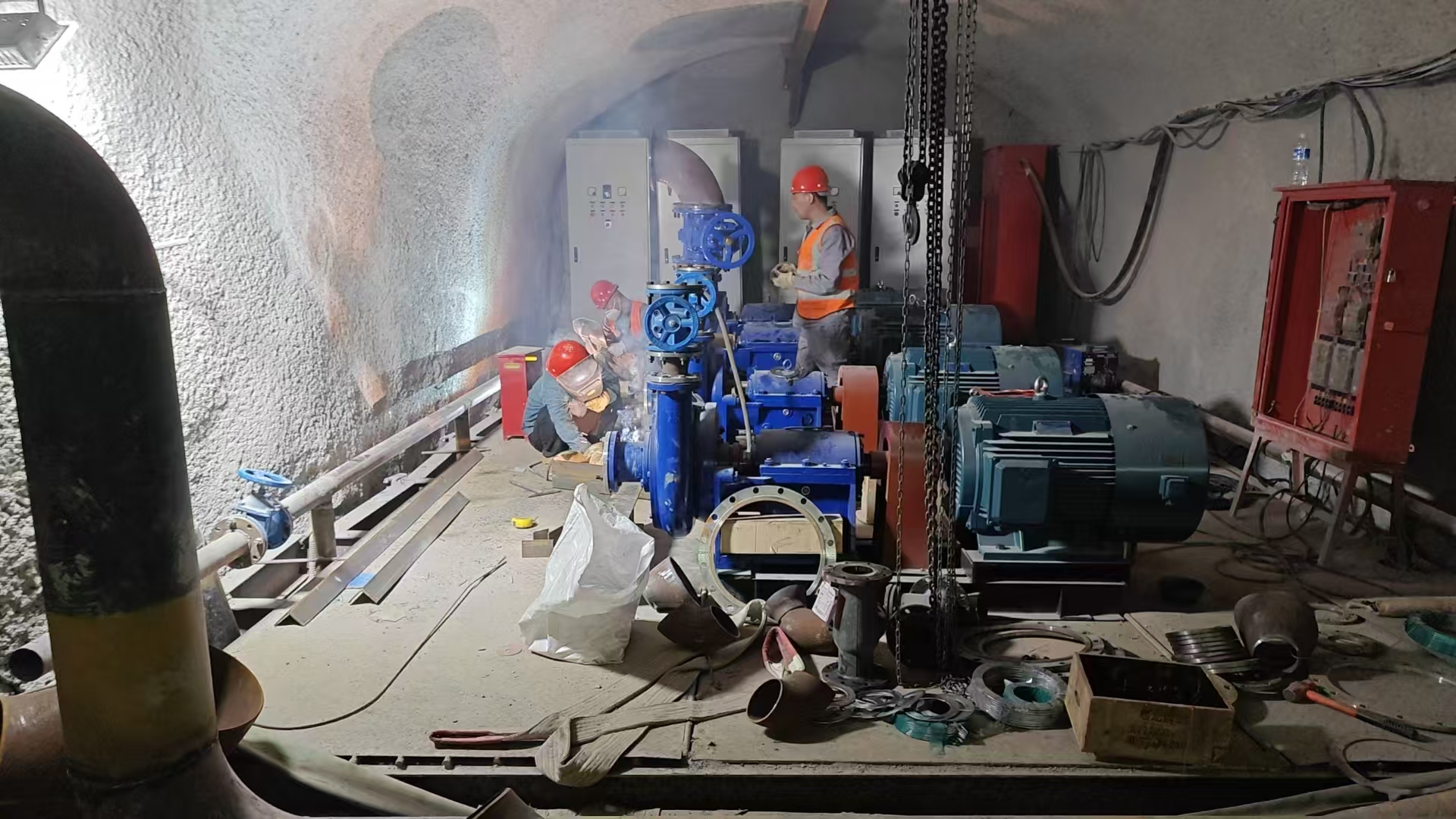 根據(jù)鐵路隧道的工程進(jìn)度,第三批主排水泵已進(jìn)場完畢,立即投入緊張的安裝工作。第三批主排水泵清水泵功率為90KW 4臺,污水泵功率為75KW 4臺,共計8臺,為不耽誤工程整體進(jìn)度,安裝工作設(shè)備進(jìn)場立即開始,預(yù)計將按期完成安裝工作,在端午節(jié)后開始調(diào)試。